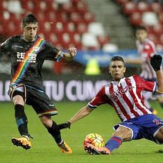 Fueron los mejores minutos de los rayistas, pero esta vez la contra la montan los rojiblancos tras un gran pase de Halilovic sobre Jony que se interna y, tras quebrar a Quini, ve la llegada de Halilovic, que se cae al controlar el balón, pero le da tiempo a tocar lo suficiente como para batir la portería madrileña a unos segundos para el descanso.
