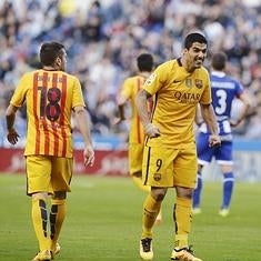 Luis Suárez celebra uno de sus cuatro goles al Deportivo.