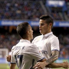 Lucas Vázquez (i) festeja su gol con James.