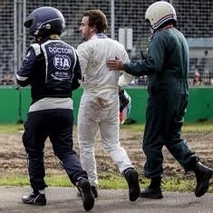 Fernando Alonso (c), tras su accidente en Melbourne.
