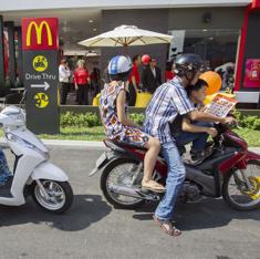 Una familia compra desde la moto en el primer McDonals de Vietnam.