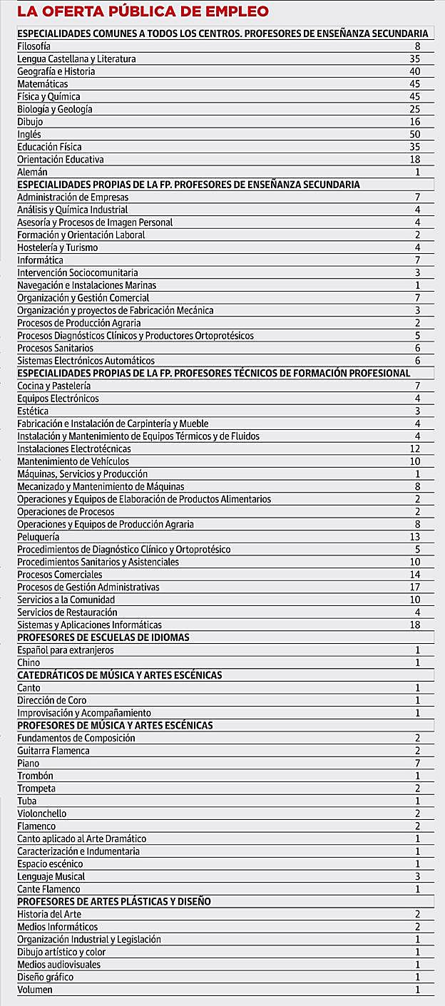 La Consejería de Educación sacará a oposiciones 575 plazas de Secundaria y Formación Profesional (FP), 25 más de las inicialmente previstas. La titular del departamento, Esperanza Moreno, presentó ayer la propuesta final a los sindicatos en la Mesa Sectorial de Educación. Se encontró con un rechazo frontal: ninguna organización votó a favor, si bien esto no impide a la Administración seguir adelante con sus planes. «No se revierte el efecto de los recortes. Desde 2012 se han perdido 3.300 puestos de trabajo», advirtió UGT. «Además, el PP incumple su compromiso electoral de reducir la horas lectivas y mejorar las ratios», añadió esta central.