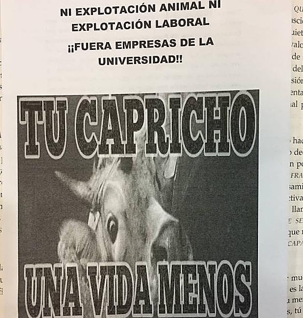 Los enmascarados han entrado en el salón nada más iniciarse el discurso de Fuertes y han repartido pasquines entre los asistentes con lemas en contra de la explotación animal y laboral, y acusando al empresario de "asesinar diariamente a miles de animales" y condenarles a una "vida de hacinamiento y tristeza".