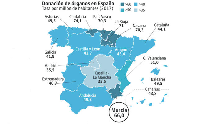 Murcia se ha convertido, gracias a este gesto tantas veces repetido, en la quinta comunidad más solidaria, con 66 donantes por cada millón de habitantes, una tasa veinte puntos superior a la media nacional. Este excelente resultado es fruto, fundamentalmente, del trabajo desarrollado en La Arrixaca, que por tercer año consecutivo es el hospital de toda España con más donantes de órganos. En concreto, en 2017 se registraron 83 donaciones en La Arrixaca, de las 97 que hubo en toda la Región.