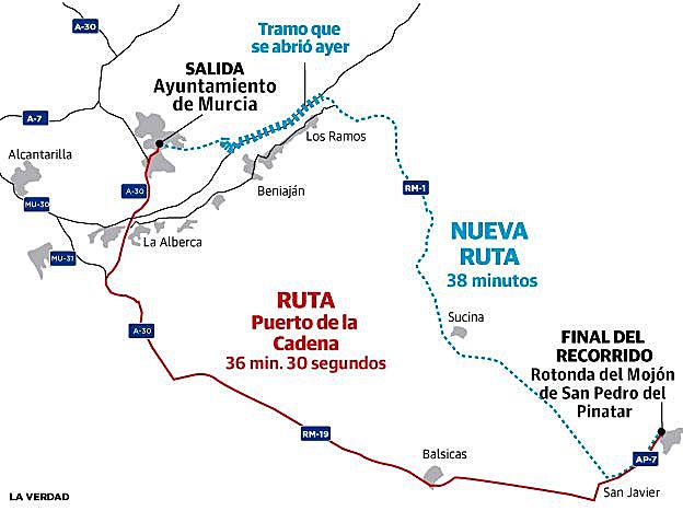 El tramo abierto ayer es una alternativa rápida para acceder al Mar Menor desde el centro y este de la capital, a la vez que mejora la conexión de las pedanías de Algezares, Los Garres, Beniaján, Torreagüera, Los Ramos, Alquerías y Zeneta con la ciudad de Murcia. LA VERDAD realizó ayer los dos itinerarios tomando como punto de partida el Ayuntamiento de Murcia, para finalizar en la salida de la autopista Cartagena-Alicante que da acceso al Mojón. La prueba se realizó a las 10.30 de la mañana y apenas hubo dos minutos de diferencia entre ambas rutas, en condiciones normales de tráfico.