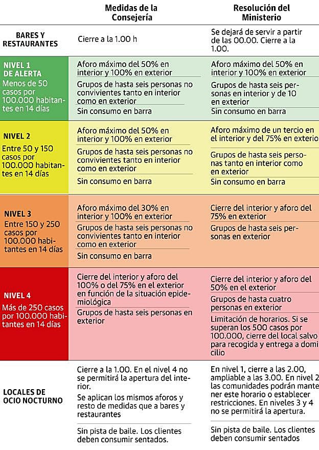 La normativa del Ministerio es más restrictiva que la Orden de la Consejería cuando las tasas de incidencia se sitúan en niveles altos de alerta, pero es más laxa en lo relativo al ocio nocturno si el riesgo es bajo. En los niveles 1 y 2 de alerta, en los que actualmente se encuadran todos los municipios de la Región de Murcia salvo Caravaca de la Cruz y Cehegín, los pubs y discotecas podrían mantenerse abiertos hasta las dos o incluso las tres de la madrugada, frente al cierre a la 1.00 actualmente establecido. No obstante, los aforos se reducen, para el nivel 2, del 50% en la norma regional a un tercio en la nacional.