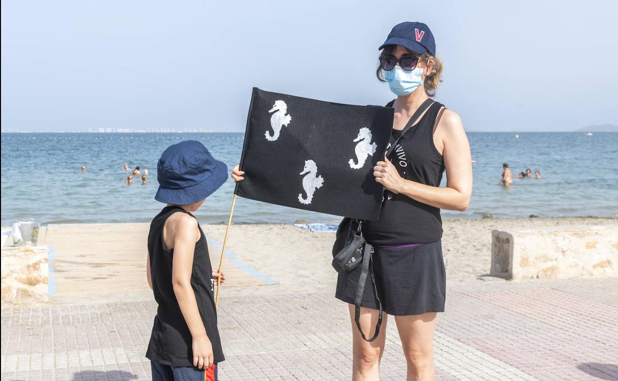 Al paso de la avioneta que paseó sobre las playas el mensaje que animaba a «salvar el Mar Menor», todos los congregados, uniformados con camisetas negras de luto ecológico, alzaron los brazos y reclamaron al unísono «un Mar Menor vivo». Banderas y paraguas negros unificaron la protesta playera. Solo las bandas moradas de una bailarina rompían el monocolor popular.