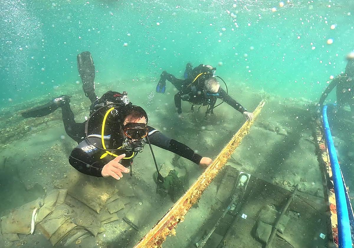 Submarinistas del Centro de Buceo del Sureste pudieron visitar el pasado viernes el yacimiento invitados por el equipo que lleva a cabo la toma de datos del pecio, con financiación de la Comunidad Autónoma. La misión está liderada por el Departamento de Prehistoria, Arqueología e Historia Antigua de la Universidad de Valencia. Entre los buzos que pudieron admirar de cerca el barco se encontraban el alcalde Ginés Campillo y Alfonso García Bachiller, gerente de dicho centro de buceo, que presta labores de apoyo a los investigadores.