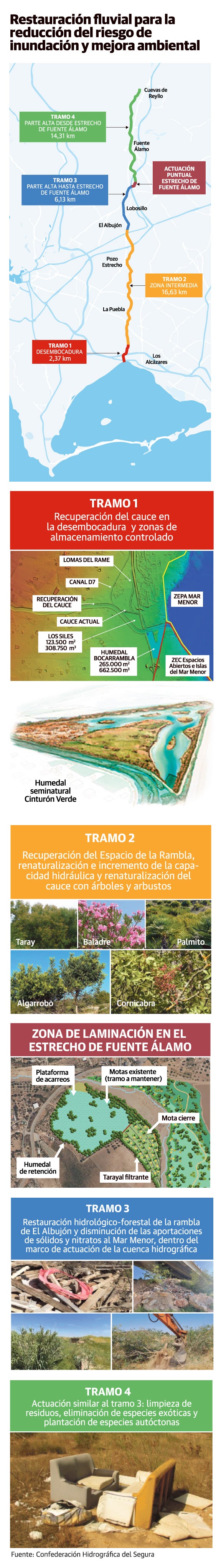 El Marco de Actuaciones Prioritarias del Ministerio, que coordina la Oficina Técnica del Mar Menor, prevé 228 millones de euros –la mayor parte del presupuesto total– para la restauración y mejora ambiental de esta cuenca, donde una buena parte se destina al Cinturón Verde (filtros verdes, humedales seminaturales y áreas de renaturalización) y otra, aparte del presupuesto, a la mejora ambiental de las ramblas y a la creación de corredores verdes que doten de conectividad a toda la red de drenaje. En este capítulo se incluye la rambla del Albujón, donde se han proyectado cinco actuaciones desde la cabecera, en Cuevas de Reyllo, hasta Los Alcázares.