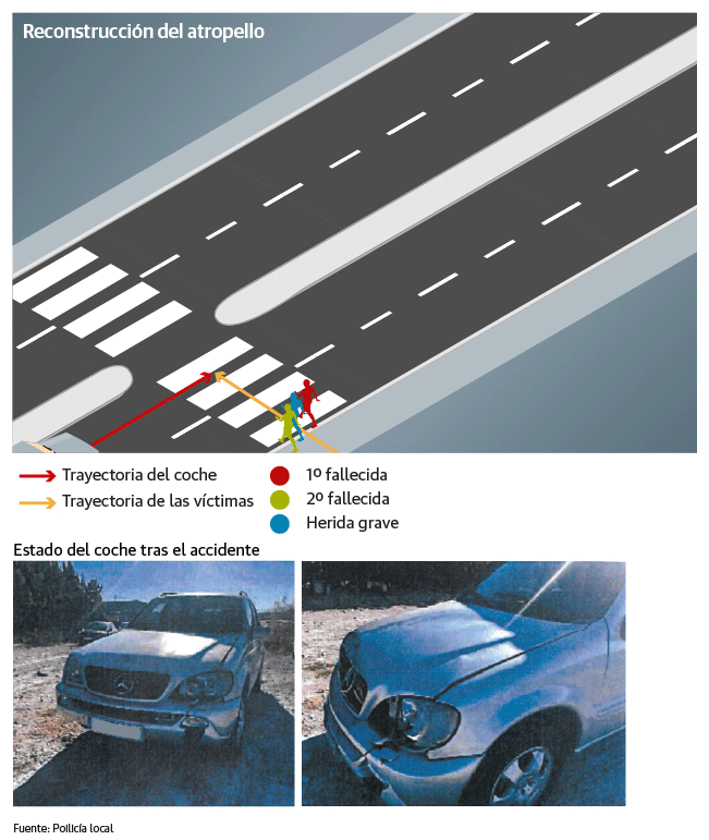 El atestado que la Policía Local elaboró incluye un croquis en el que se explica que las tres víctimas salieron despedidas a raíz del arrollamiento. Dolores Abenza, la primera fallecida, quedó tendida en la calzada a 19 metros del punto del impacto. Sus amigas, Salvadora Martínez y Juani Palazón -también fallecida-, salieron despedidas ocho y nueve metros, respectivamente. Los agentes destacan que Miguel no vio a las tres mujeres cruzar el paso de peatones «pese a ser un tramo de la vía con buena visibilidad y estar suficientemente iluminado». Un hecho que los municipales atribuyen a la merma de sus facultades debido a la ingesta de bebidas alcohólicas.