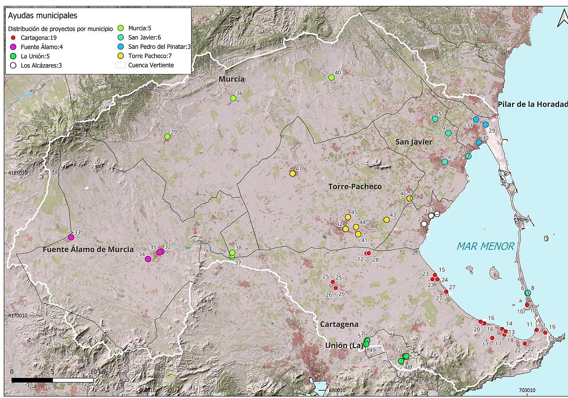 El reparto de los 20 millones de euros se ha distribuido de la siguiente manera: Los Alcázares y San Javier (3,75 millones de euros cada uno); Cartagena y San Pedro del Pinatar (3,5 millones de euros cada uno); Torre-Pacheco, Murcia y Fuente Álamo (1,5 millones de euros cada uno) y La Unión (1 millón de euros).