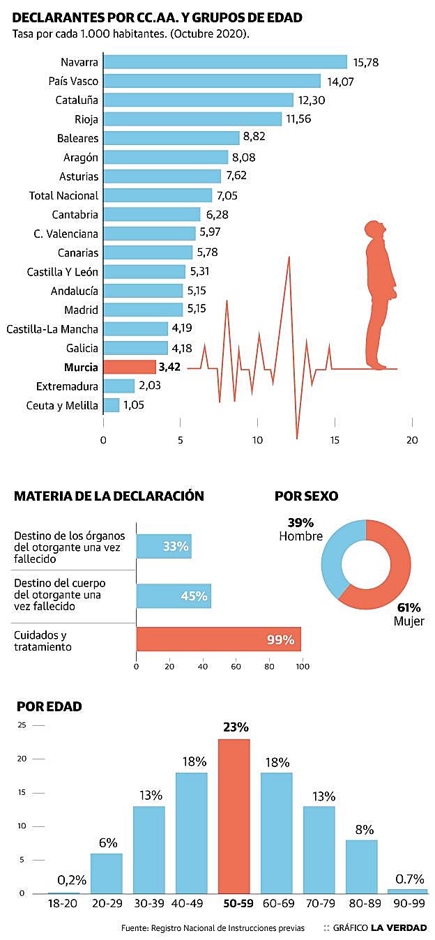 Desde 2006, cualquier ciudadano puede registrar un documento de instrucciones previas, conocido como testamento vital, para especificar los cuidados que desea recibir en la etapa final de su vida. Sin embargo, es una herramienta muy poco utilizada en la Región. Apenas 5.227 personas han plasmado por escrito sus instrucciones previas en estos 16 años, según los datos facilitados por la Consejería de Salud. Solo en Extremadura, Ceuta y Melilla hay menos testamentos vitales registrados. Por el contrario, Navarra, País Vasco y Cataluña se sitúan a la cabeza.