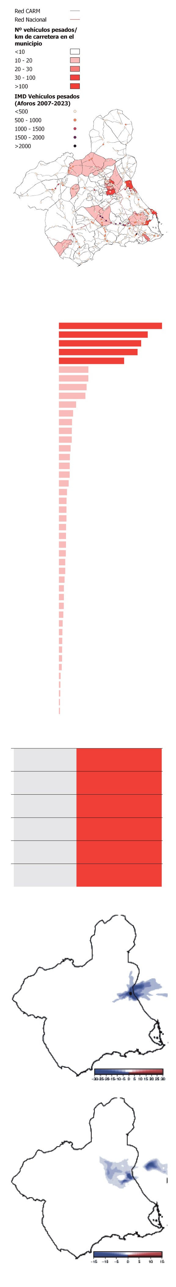 Las carreteras convencionales de la Región de Murcia soportan una densidad media de 19,8 camiones por kilómetro y día. El nivel regional se multiplica ... por seis en el municipio de Santomera, y en concreto en la travesía urbana de la RM-414, que conecta esta localidad de la comarca Oriental con Abanilla. En esta vía, de la que es titular la Comunidad Autónoma, concentra un promedio de 118 vehículos de más de 3,5 toneladas por cada kilómetro y jornada, la mayor tasa de la Región. Le siguen, por este orden, Los Alcázares (101,6), Lorquí (94,1), Las Torres de Cotillas (90) y San Pedro del Pinatar (74,6), según constata un estudio realizado por la Universidad de Murcia (UMU). En el lado opuesto, con las menores densidades de este tipo de vehículos están Moratalla (1.2), Ricote (1,2), Aledo (1,5), Pliego (1,7) y Campos del Río (2).