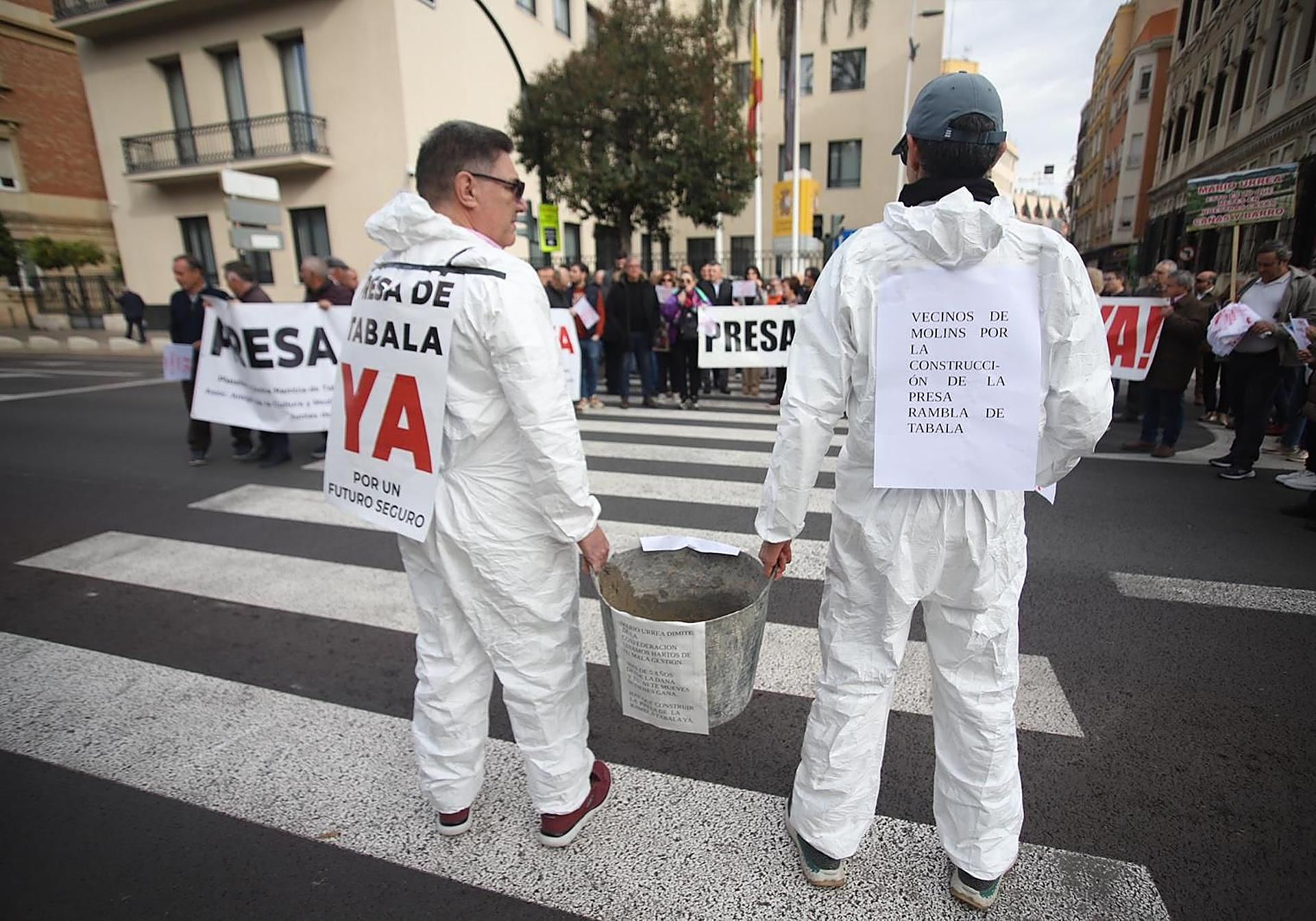 Los vecinos de Beniel, Orihuela y de las pedanías al este de Murcia han vuelto a la carga este sábado en sus movilizaciones para exigir la construcción de una presa en la rambla de Tabala. El retraso histórico que sufre esta infraestructura ha propiciado numerosas protestas vecinales tanto en el propio cauce como en la ciudad de Murcia. En esta ocasión, los afectados por las inundaciones que origina esta rambla se han concentrado frente a la Delegación del Gobierno, donde exigieron a la Confederación Hidrográfica del Segura «agilidad» para avanzar en los trámites del proyecto, cuya redacción se encargó en 2023.