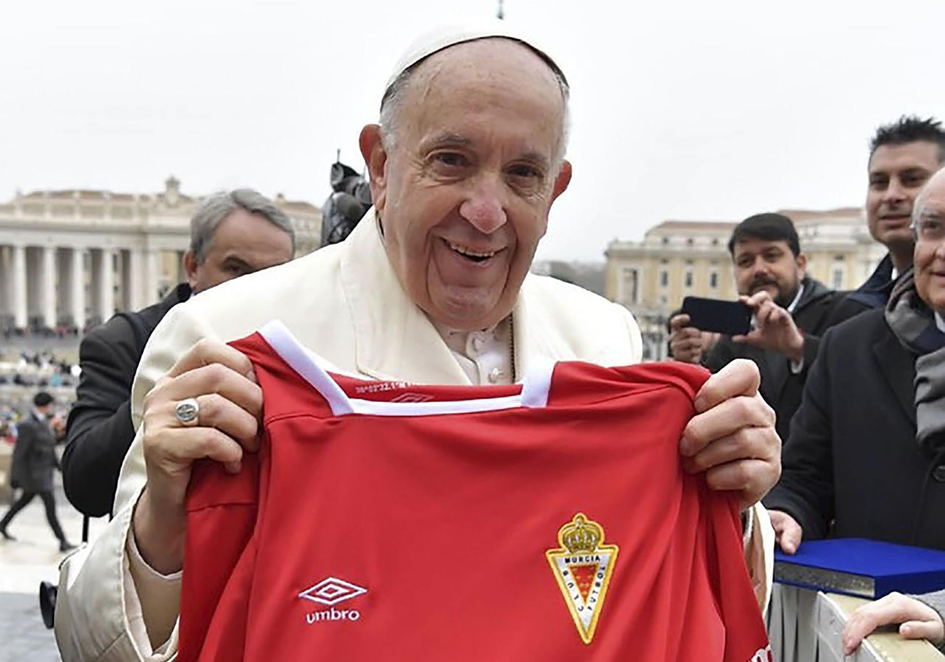 Otra imagen que se recordará para siempre en la Región será la del Pontífice argentino posando en la Plaza de San Pedro con una camiseta del Real Murcia, como si se tratara del último fichaje del conjunto grana. La fotografía se tomó el 14 de febrero de 2018, festividad de San Valentín y fue posible gracias al sacerdote murciano Antonio Carpena, capellán del club, que acudió a Roma formando parte de una delegación que también encabezaba Fernando López Miras y que iba a entregar al Papa el óvalo del Año Jubilar de Caravaca 2017. Jorge Mario Bergoglio fue un gran aficionado al fútbol, reconociéndose seguidor del equipo argentino de San Lorenzo de Almagro. También ha posado con camisetas del UCAM Murcia durante las audiencias a la familia Mendoza.