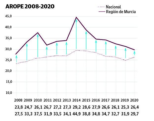 Sobre el riesgo de pobreza y exclusión, el descenso de 2,2 puntos sobre el ejercicio pasado sitúa la Región como la segunda autonomía que más ha reducido esta tasa porcentualmente (6,9%). No obstante, la tasa regional es un 12% más elevada que la media y es la quinta región con el índice Arope más alto, solo por detrás de Extremadura, Canarias, Andalucía y Castilla-La Mancha.