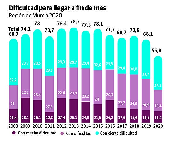 La pandemia ha disparado la pobreza en la Región, más allá de su impacto sobre la salud. Y, especialmente, se refleja en la evolución de la llamada pobreza severa, que mide el grado más intenso de la escasez de recursos económicos. Según calcula el último informe de la Red Europea de Lucha contra la Pobreza y la Exclusión Social en el Estado Español (EAPN-ES), unos 169.000 murcianos se encuentran en situación de pobreza severa, 19.000 más que el año anterior. Pero, además, otras 115.000 personas, 51.000 más que el año anterior, sufren privación material severa (PMS), un indicador que señala la población que no puede acceder a productos concretos como comer carne, mantener la temperatura adecuada en la vivienda, estar al día en pagos y afrontar gastos imprevistos.