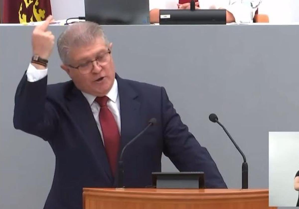 Durante su intervención, José Vélez ha protagonizado el momento más polémico de la segunda sesión del Debate del estado de la Región. El portavoz socialista reivindicaba que ha llegado más agua a la Región en los últimos años, con el Gobierno central de coalición, que durante la etapa del ejecutivo popular. «Agua para todos», ha concluido, haciendo una peineta.