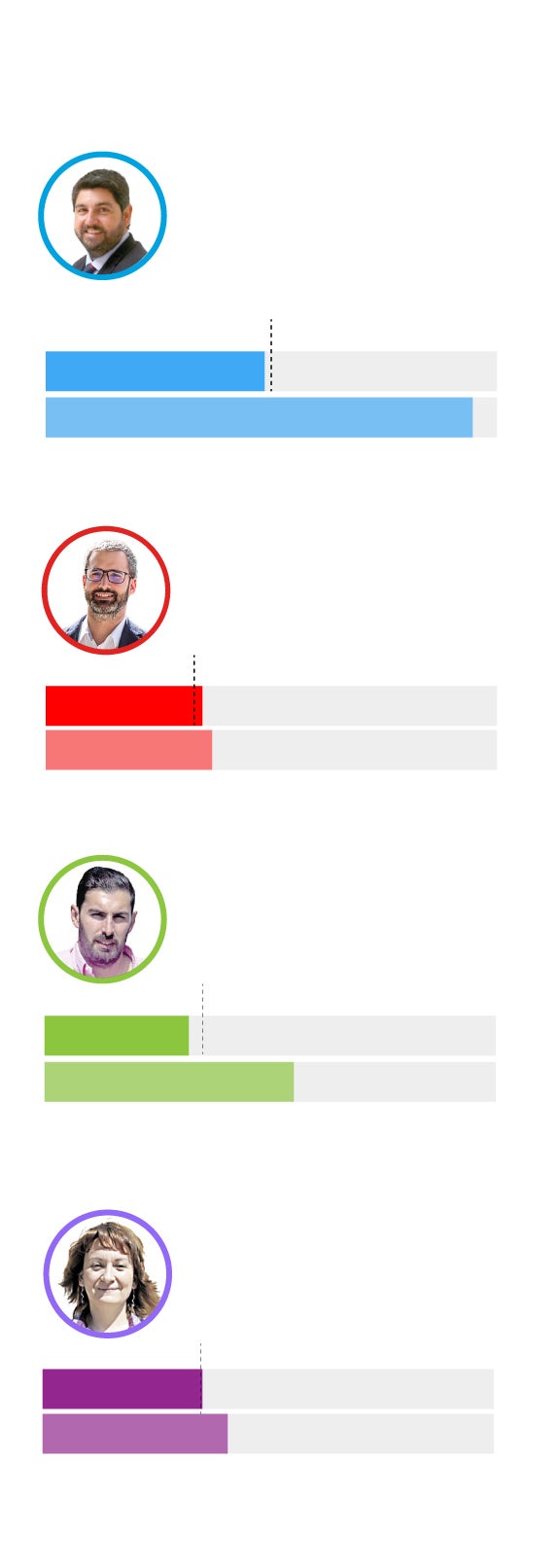 La única líder que sube es María Marín, de Podemos, con una décima más hasta los 3,6. En este barómetro, entra por primera vez el nuevo secretario general del PSRM-PSOE, que debuta con una valoración del 3,8, superior al que obtuvo su predecesor, José Vélez, que en la pasada encuesta se quedó en el 3,1.