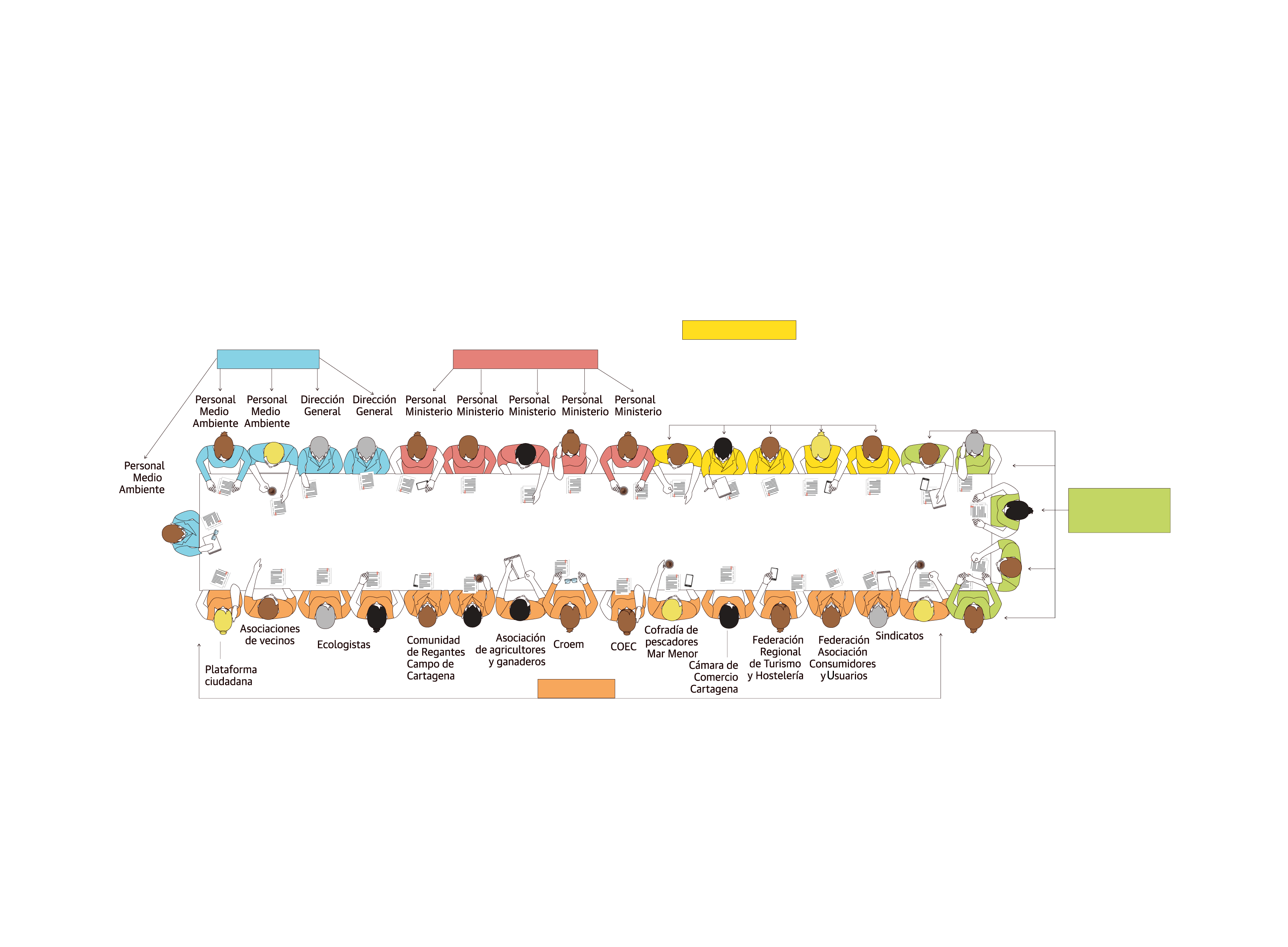 Los colectivos que estarán presentes son las plataformas ciudadanas vinculadas a la defensa del Mar Menor (un representante), asociaciones de vecinos (1), organizaciones ecologistas (2) Croem (1), COEC (1), Comunidad de Regantes del Campo de Cartagena (1), asociaciones de agricultores y ganaderos (2), Cofradía de pescadores del Mar Menor (1), Cámara de Comercio, Industria y Navegación de Cartagena (1), Federación Regional de empresarios de hostelería y turismo (1), Federación de Asociaciones de Consumidores y Usuarios (1) y sindicatos (2).