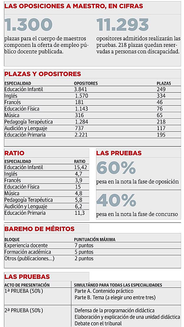 Los aspirantes a cada una de las de 1.300 plazas de maestro convocadas este año ya pueden ir afinando sus posibilidades. La Consejería de Educación publicó ayer la lista definitiva de admitidos a las oposiciones, que suman un total de 11.293 aspirantes. Una cifra que probablemente bajará de los 11.000 el 22 de junio, día del primer examen, como es habitual en las oposiciones.