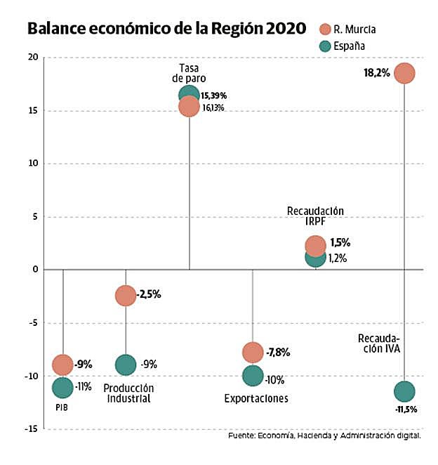 «Incluso ahora, en el contexto actual de caída generalizada, la economía de la Región de Murcia es una de las que mejor está resistiendo esta crisis sin precedentes», señala el informe, que subraya el hecho de que Murcia se situara a la cabeza en el aumento de la recaudación de IRPF e IVA en 2020.