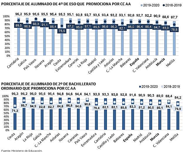 El Ministerio de Educación valora en su informe que las tasas de promoción en el último curso de la ESO se incrementaron el año del confinamiento respecto al curso anterior en todas las comunidades, «superando el porcentaje resultante el 90% en todos los casos, salvo en la ciudad autónoma de Melilla (87,7%) y Región de Murcia (88,6%)», refleja el informa nacional.