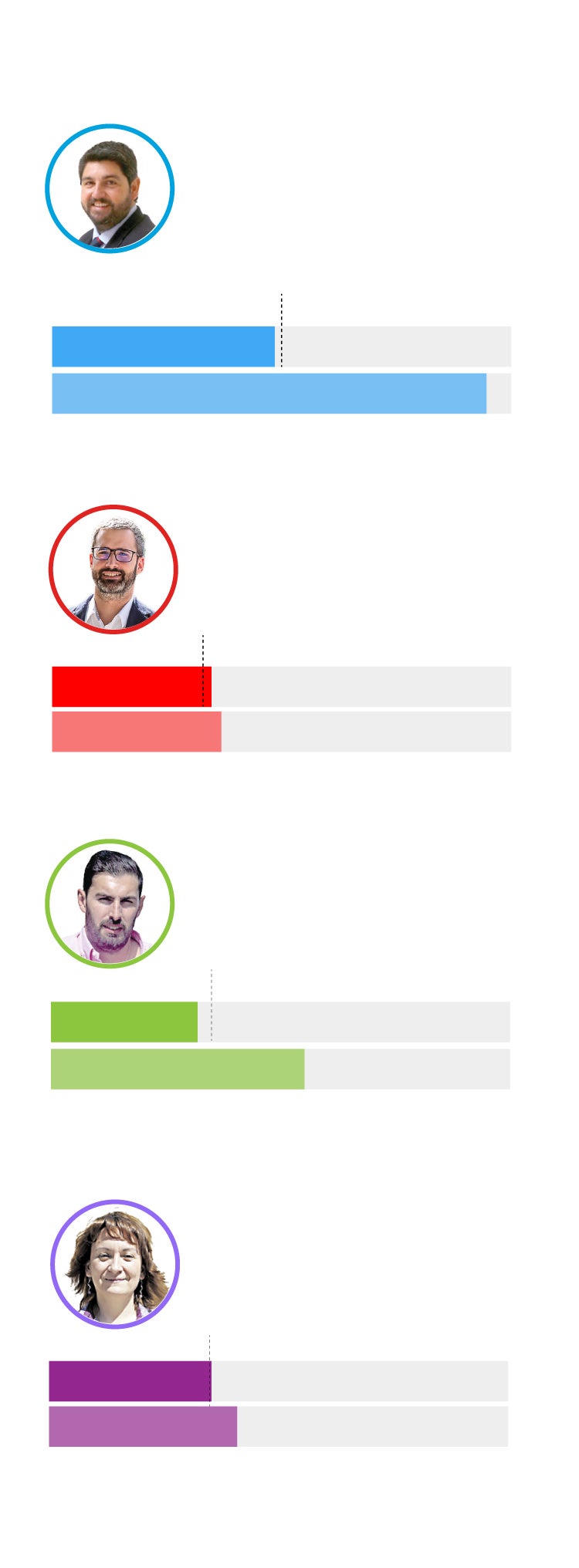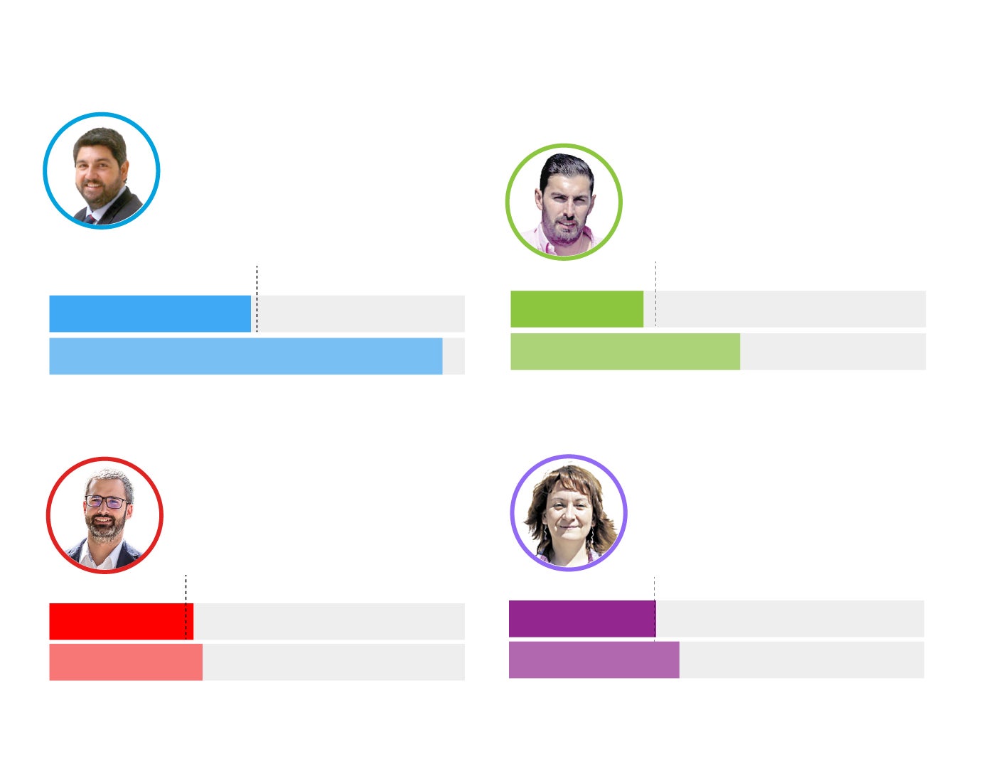 López Miras es el que además cuenta con un mayor grado de conocimiento (93%), seguido de Antelo (52,8%), Marín (42,5%) y Lucas (37%).