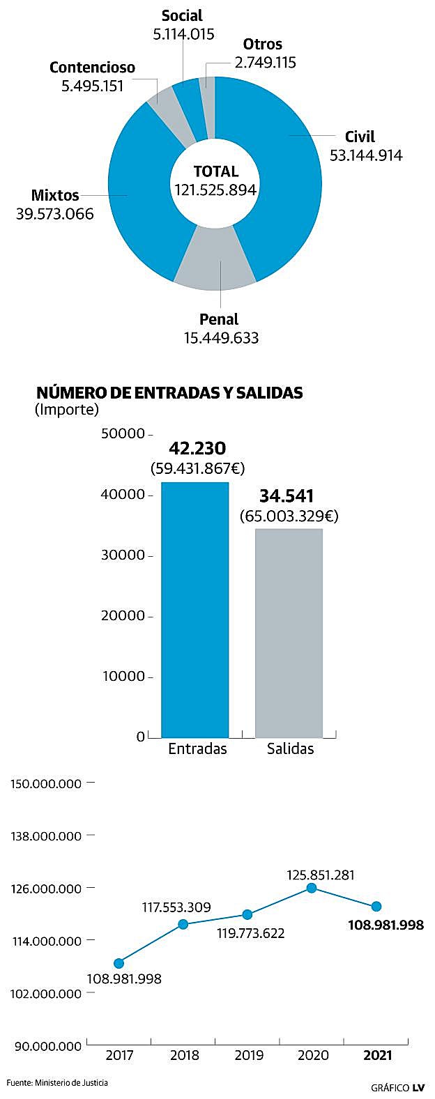 Entre enero y marzo de este año se ingresaron en los juzgados murcianos 59,4 millones de euros -con más de 42.000 entradas diferentes-, pero se devolvieron depósitos por hasta 65 millones de euros. El saldo total de las cuentas al terminar el primer trimestre del año era concretamente de 121.525.894 euros -más de 4.398 millones en toda España-.