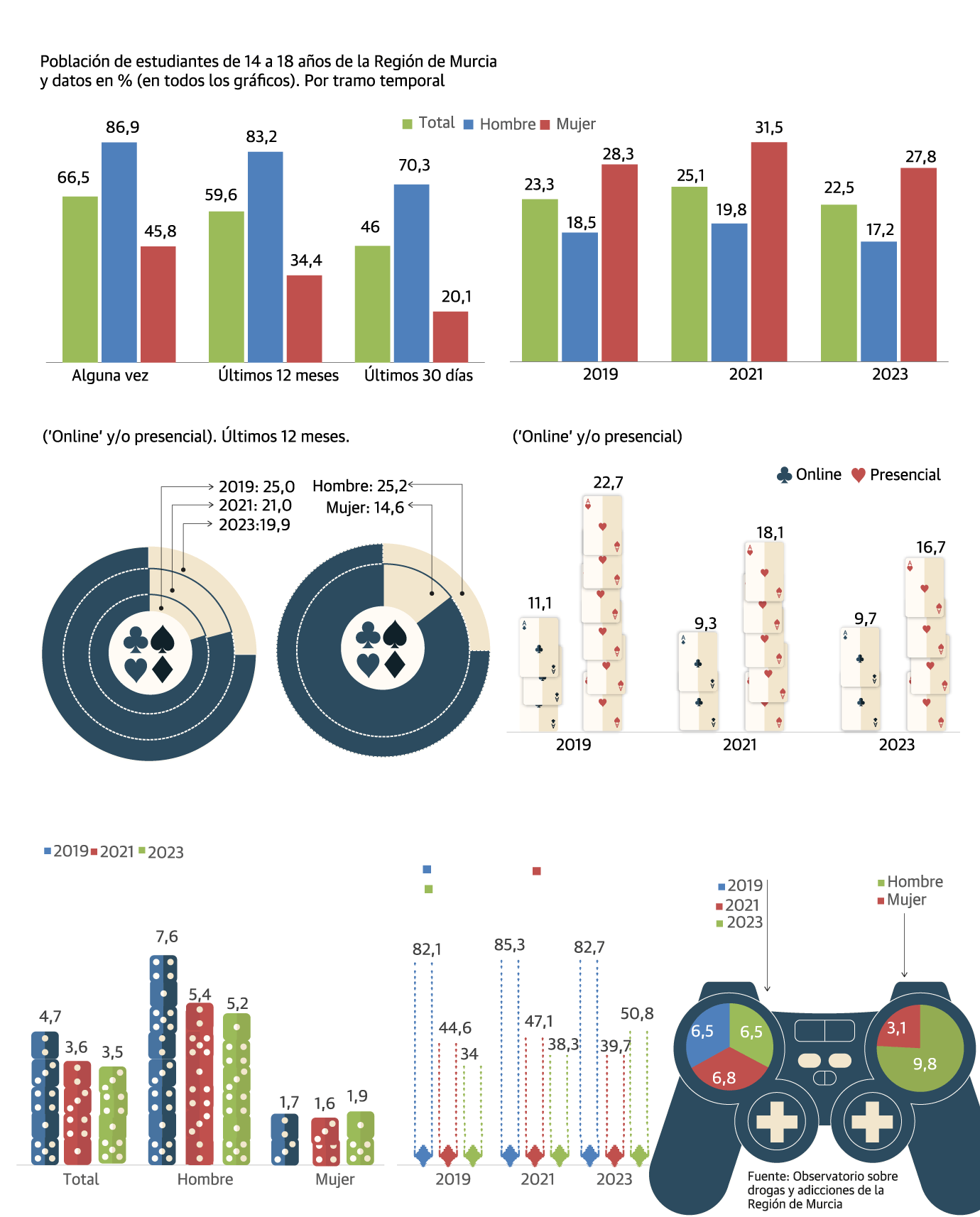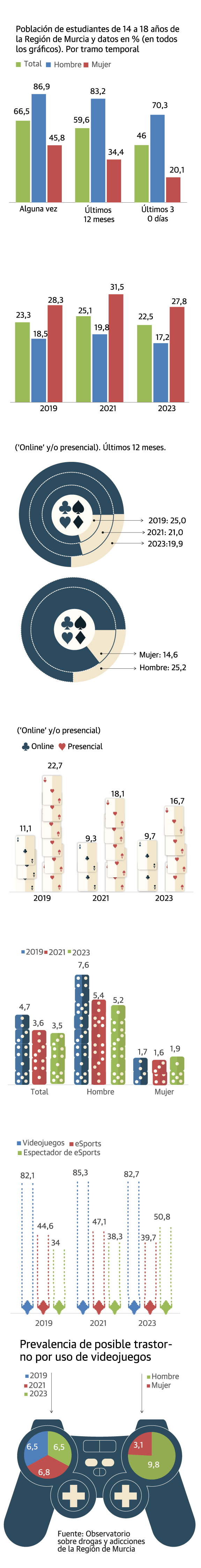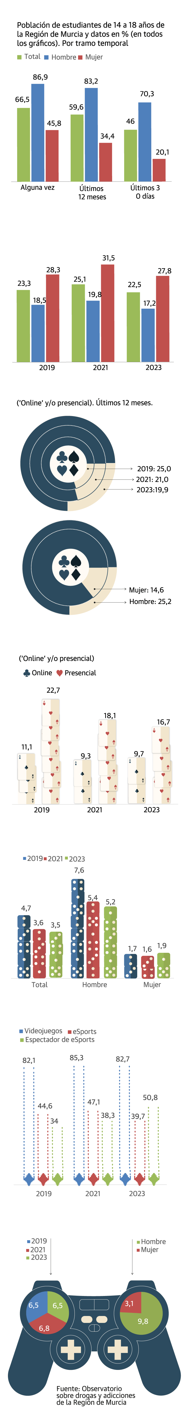 La Encuesta sobre Uso de Drogas en Enseñanzas Secundarias (Estudes) recoge una reducción de la participación de los adolescentes en juegos de azar en la Región de Murcia. Dos de cada diez estudiantes de entre 14 y 18 años jugaron durante el año anterior a la encuesta, bien 'online' o presencialmente. En 2019, el porcentaje ascendía al 25%. La coordinadora del grupo de adicciones del Colegio de Psicología de la Región de Murcia, María Dolores Oñate, pone en cuestión este descenso. «En nuestras consultas, la prevalencia de jóvenes de 20 a 25 años con adicción al juego es cada vez mayor, y son personas que han comenzado a jugar mucho antes», señala.