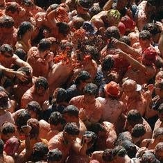 Los más de 22.000 participantes que este miércoles se han dado cita en la tradicional Tomatina de Buñol (Valencia) han empezado a las 10.45 horas a lanzar las 150 toneladas de tomates dispuestas por la organización, una cifra récord con la que se conmemora el 70 aniversario de esta singular batalla.