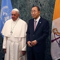 El Sumo Pontífice argentino fue recibido por el secretario general de la ONU, Ban Ki-moon, su esposa y un grupo de niños que le entregaron unas flores poco antes de las 8.30 horas. Se trata de la quinta visita de un Papa a la sede de Naciones Unidas, después de las de Pablo VI en 1965, Juan Pablo II en 1979 y 1995 y Benedicto XVI en 2008.
