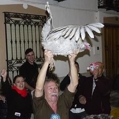 La idea era lanzarla desde algún tejado o alguna casa más tarde, después de las 20:00 horas, pero finalmente un vecino la ha sacado junto a un pavo más pequeño, para de esta forma continuar la tradición, aunque sin lanzamiento.