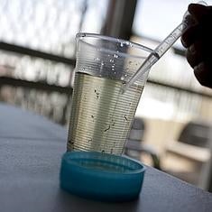 Un biólogo toma una muestra de agua con larvas de mosquitos Aedes aegypti.