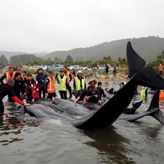 "Las cerca de 240 ballenas que habían encallado entre Puponga y Pakawau el sábado pudieron casi todas reflotarse anoche por sus propios medios gracias a la marea alta y se encuentran en aguas superficiales" cercanas, dijo el portavoz del departamento neozelandé de Conservación, Herb Christophers. "El centro de atención esta mañana será intentar devolver las 17 restantes al agua cuando llegue la próxima marea", precisó.