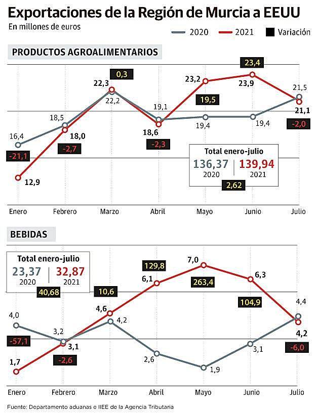 Sin embargo, la mejoría se acelera a partir del mes de marzo, cuando se levantan los aranceles, con un aumento del 16,5% hasta julio, y la disfrutan sobre todo las bebidas, con incrementos de las exportaciones del 40,7% entre enero y julio y del 73,14% entre marzo y julio.