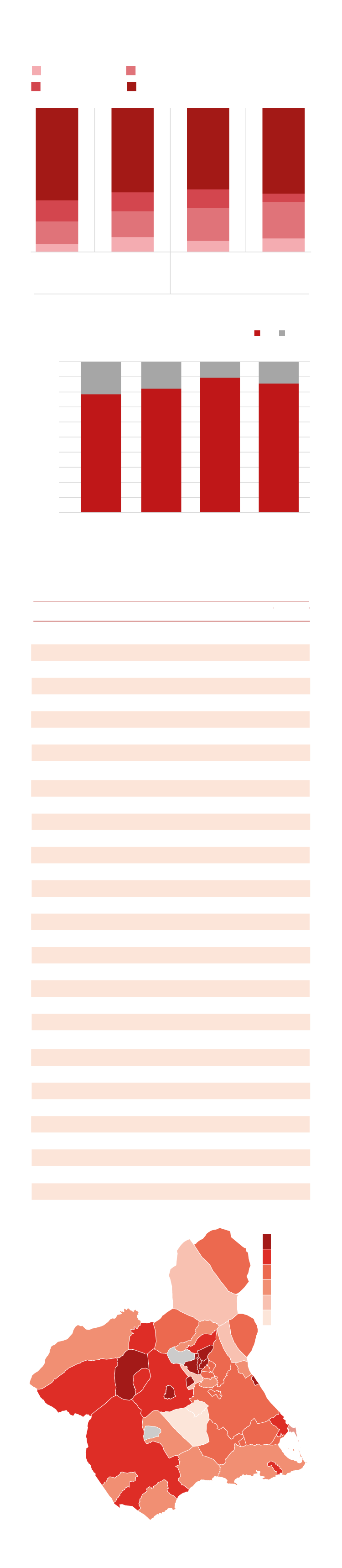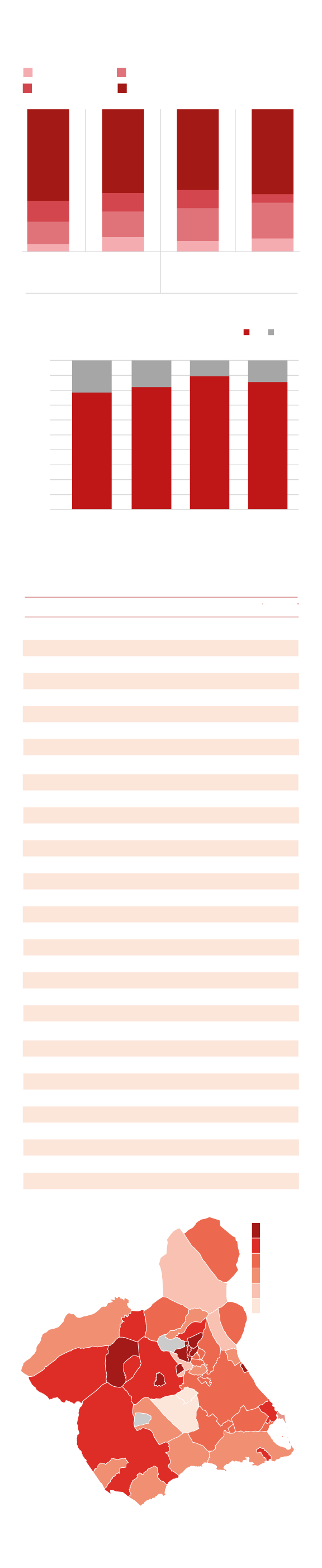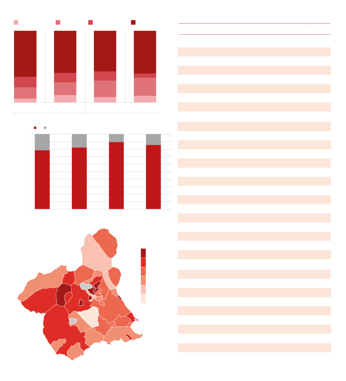 Por otro lado, es relevante que la mayor proporción de empresas consolidadas (+25 años) tiene lugar en las pymes medianas y grandes familiares (43,5%). Mientras que las micro familiares son las que tienen un mayor porcentaje de empresas emprendedoras. Finalmente, en cuanto a la mayor presencia de empresa familiar por municipios, en términos relativos, destacan las tasas de Beniel (96,7%), Cehegín (96,1%), Archena (94,6%), Caravaca de la Cruz (93,7%), Calasparra (91,3%), Lorca (90,5%), La Unión (90,4%) y Bullas (90%).