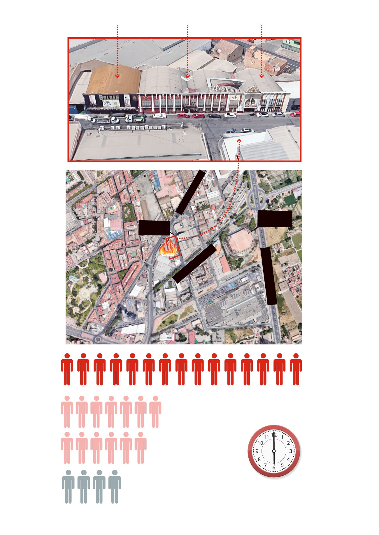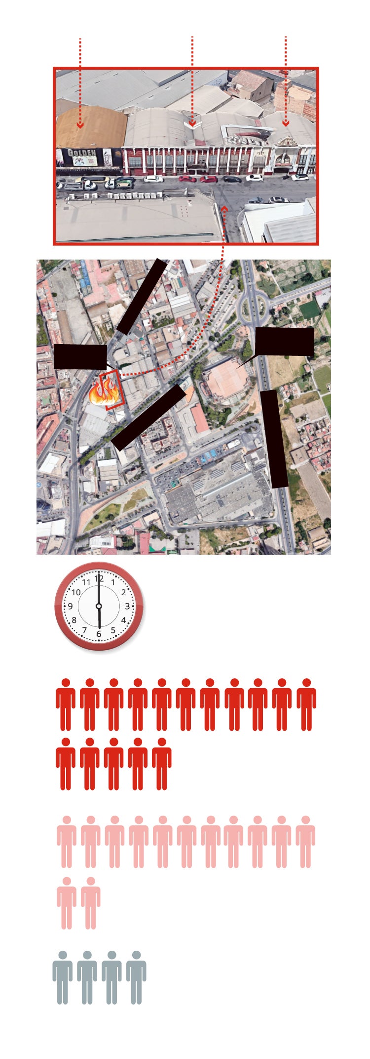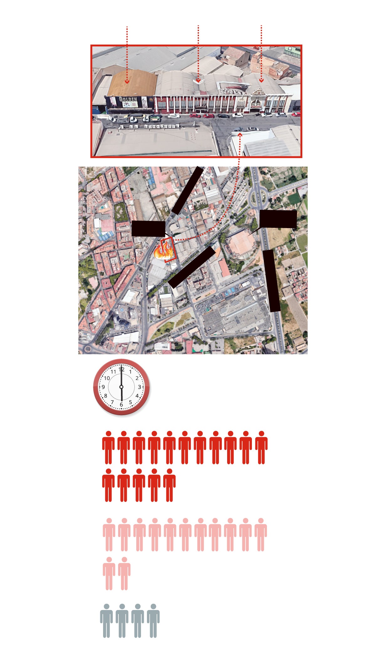 Una enorme bola de fuego iluminó el cielo de la noche murciana anunciando la tragedia minutos antes del amanecer. Habían pasado ya las seis de la mañana cuando las celebraciones habituales en las discotecas de la zona de ocio nocturno de Atalayas se detuvieron bruscamente y dieron paso al caos: gente corriendo, toses, gritos y angustia por la propagación de un incendio que afectó tres locales contiguos: Fonda Milagros, Teatre y Golden, en la calle Isla Cristina de Murcia, y que se saldó con 13 personas fallecidas tras unas extenuantes y complejas labores de búsqueda para intentar localizar a los 15 desaparecidos contabilizados por los investigadores, entre los que estarían los fallecidos. Hasta este domingo eran 18 los desaparecidos, pero a primera hora de este lunes se localizó a tres personas con vida que se encontraban en otro lugar sin cobertura.