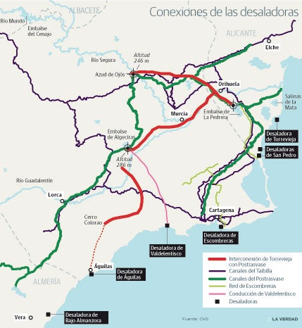 Lucas Jiménez recordó que ya existen varias interconexiones entre las desaladoras y las infraestructuras del Postrasvase, que vienen de épocas y gobiernos anteriores. En la etapa de Mariano Rajoy se construyó una conexión desde la planta de Valdelentisco hasta el embalse de Algeciras, en Librilla, en parte para asegurar los abastecimientos; mientras que el pantano de La Pedrera, el segundo mayor de la cuenca, sirve de regulación para las aguas del Tajo y para almacenar la producción de Torrevieja, que hasta ahora se destina a los regadíos del Campo de Cartagena y la zona de Pilar de la Horadada.