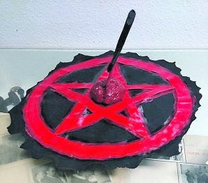 La pieza (en la imagen) formaba parte de una instalación organizada por el profesor del ciclo de Marketing Pedro José Sánchez, quien encargó a los estudiantes el diseño de una 'feria' con puntos de animación a la venta y carteles relacionados con Halloween. Entre las obras, los estudiantes elaboraron un cartel en relieve con una estrella de cinco puntas y un corazón atravesado por un cuchillo, que quedó instalado en el pasillo de la Secretaría.