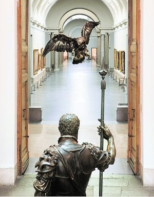 Un águila sobrevuela la estatua broncínea de Carlos V. Un gorrión albino se posa sobre 'Las Meninas'. Un esplendoroso semental, origen del encaste de Veragua, cruza la mirada con el toro de 'El rapto de Europa' de Rubens. Un ejército de multicolores libélulas, mariposas y escarabajos cornudos compiten en belleza y extravagancia con los que pintó El Bosco en 'El carro de heno'. Son solo algunas de las criaturas, rarezas y maravillas que han encontrado acomodo temporal en el Museo del Prado en un matrimonio entre arte y naturaleza celebrado por Miguel Ángel Blanco (Madrid, 1958), artífice y comisario de la muestra 'Historias Naturales'.