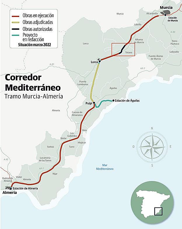 El contrato de este tramo, correspondiente a la línea Murcia-Almería, tiene un valor estimado de 178.838.554 euros (sin IVA) y un plazo de ejecución de 30 meses. Con esta licitación, todos los tramos entre Murcia y Almería se encuentran en obras o en fase de contratación (licitación o adjudicación), a excepción de la integración en el núcleo de Lorca, cuyo proyecto básico se encuentra en fase de redacción.