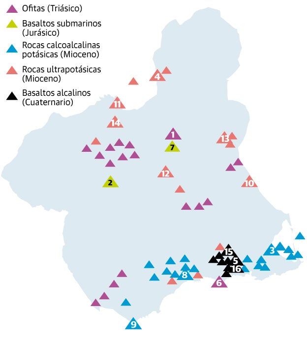 No obstante, reconoce Guillén ahora que el volcán de Cumbre Vieja, en la canaria isla de La Palma, ha centrado todas las miradas en el vulcanismo, la huella de estos fenómenos geológicos cuenta en la Región con unos 60 afloramientos -«todos ellos inactivos», insiste-. La causa principal es la proximidad de la Región a la zona de fricción de las placas tectónicas africana y euroasiática, así como las numerosas y profundas fallas que surcan la Comunidad. Y cita las abundantes aguas termales que manan en estas tierras (Archena, Fortuna, Mula, Moratalla, Lorca, Alhama, Mazarrón,...) como el último rescoldo de este pasado volcánico que, por su situación geológica, no permite descartar que vuelva a producirse en cualquier momento, como ya ocurrió desde hace 230 millones de años (Ma), en el Triásico, el Jurásico, el Mioceno y el Cuaternario. Pero, sentencia Guillén, su última actividad se remonta a hace 2,6 Ma «en el entorno de la ciudad de Cartagena: Tallante, Cabezo de la Viuda y de la Fraila...».