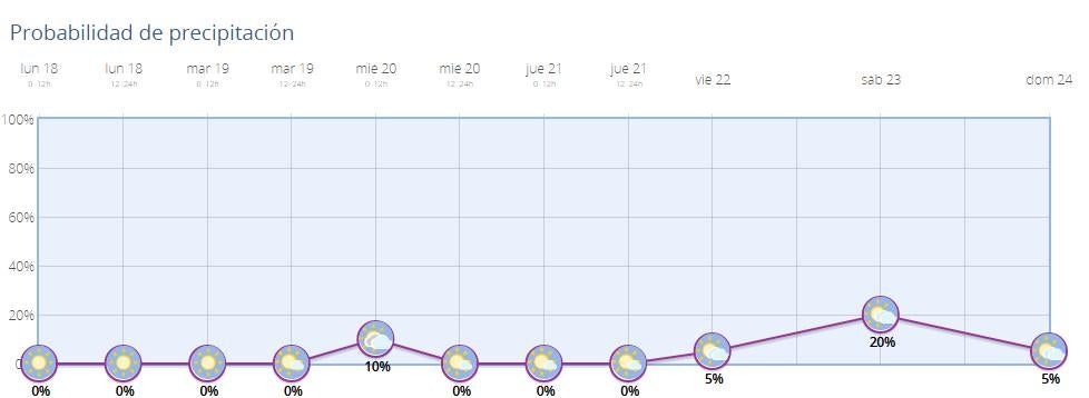 No se espera la presencia de precipitaciones durante ningún día de la semana, siendo la probabilidad máxima del 20 % el sábado.