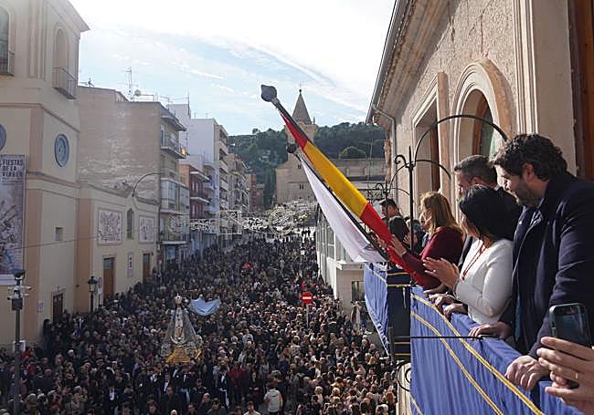 Desde el balcón de la Casa Consistorial, recibiendo a la Patrona por parte de la alcaldesa de Yecla, el presidente de la Comunidad Autónoma, el presidente de la Asociación de Mayordomos de la Purísima Concepción y la presidenta de la Corte de Honor de la Purísima Concepción. A. Yecla