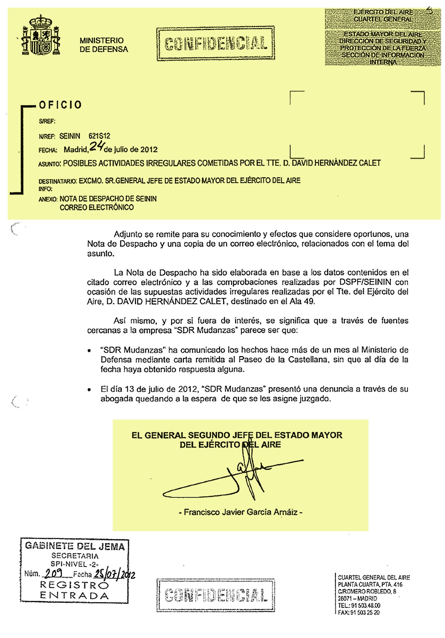 El informe de la Dirección de Seguridad y Protección de la Fuerza, del cuartel general del Ejército del Aire, está fechado a 20 de julio de 2012 bajo el epígrafe 'Posibles actividades irregulares cometidas por el Teniente David Hernández Calet', el principal acusado del caso. La nota, a la que ha tenido acceso este periódico, va dirigida al entonces jefe del Estado Mayor del Ejército del Aire, general José Jiménez Ruiz, que una semana después sería sustituido por el Gobierno, junto al resto de los jefes de los Ejércitos, por el general Francisco Javier García Arnáiz, que firma la nota. Entre las «comprobaciones realizadas» por la sección de información interna se resume el modo de operación que tenía el teniente Calet y el resto de imputados en el fraude. Es decir, la forma de cobrar la indemnización por traslado forzoso sin levantar sospechas. Cada militar que lo solicitaba recibía una media de entre 3.000 y 3.500 euros, según el destino y la distancia de la mudanza.