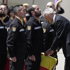 El ministro de Defensa, Pedro Morenés, ha sido el encargado de depositar los distintivos sobre el féretro de Martín Rebollo, en un acto en la Base Aérea de Zaragoza, donde está ubicado el IV Batallón de Intervención en Emergencias del que formaba parte.