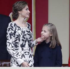 La Reina ha sido fiel a Varela en el desfile militar del 12 de octubre. Doña Letizia ha optado por un abrigo vestido en tweed blanco roto, bordado a mano en cristal de georgette negro que le quedaba como un guante. Magrit, como también es habitual, firmaba sus estiletos en color nude. La monarca ha escogido un favorecedor moño bajo para recoger su media melena y dejar a la vista los discretos pendientes -no como el año pasado- que don Felipe le regaló por el nacimiento de Leonor.