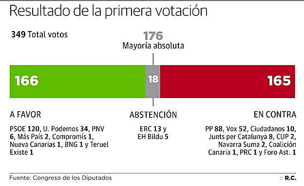 Pedro Sánchez vio truncado su primer intento de investidura, un revés que daba por descontado porque alcanzar la mayoría absoluta de 176 votos nunca entró ni en los cálculos de los socialistas más optimistas. Pero fue una derrota con aroma de victoria para la segunda votación de mañana. Solo con que se repita el resultado, 166 'síes', 165 'noes' y 18 abstenciones, tendría asegurado un nuevo mandato en la Moncloa, aunque sea de duración imprevisible.