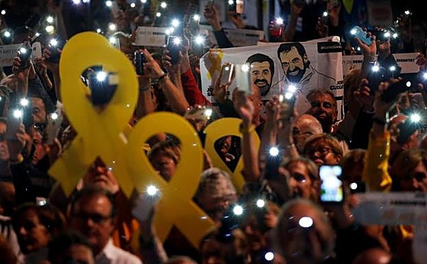 El independentismo, en cualquier caso, trató este martes de aparcar sus diferencias para cerrar filas con los 'jordis', convertidos por el imaginario soberanista en símbolos de la lucha de la Cataluña independentista contra el resto de España. «Un año de vergüenza, un año de dignidad. Nada nos parará», rezaba el lema de la protesta, a la que acudieron varios miles de personas, lejos de las grandes protestas de los últimos años.